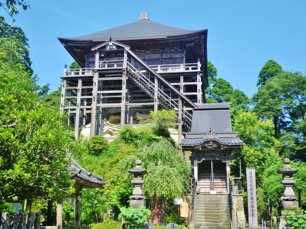 山頂の巨大な岩の上に建つお堂と下から支える何十本もの柱が見せる壮麗な姿。この笠森寺観音堂は、後一条天皇の勅願により1028年に建立された日本で唯一の「四方縣造」として知られ、国指定の重要文化財となっています。