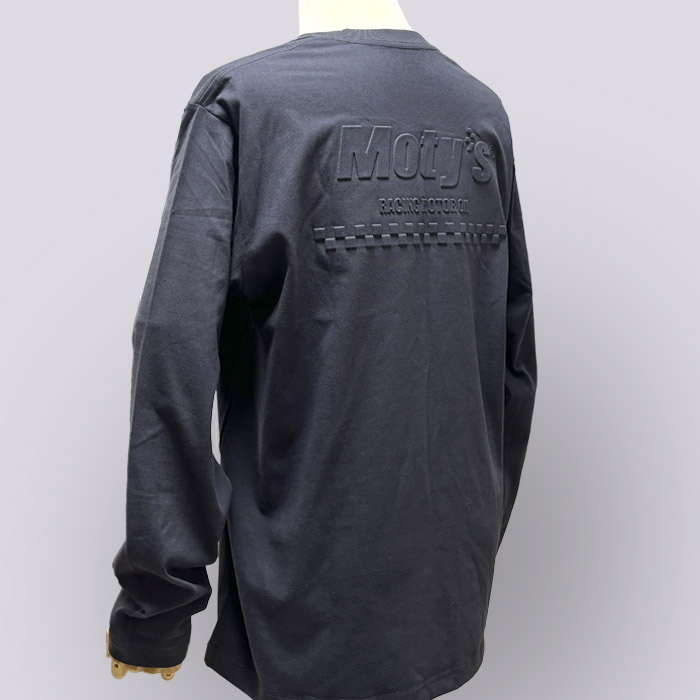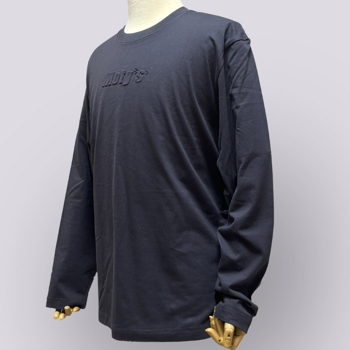前後にエンボス加工されたロゴを配置した長袖Tシャツです。